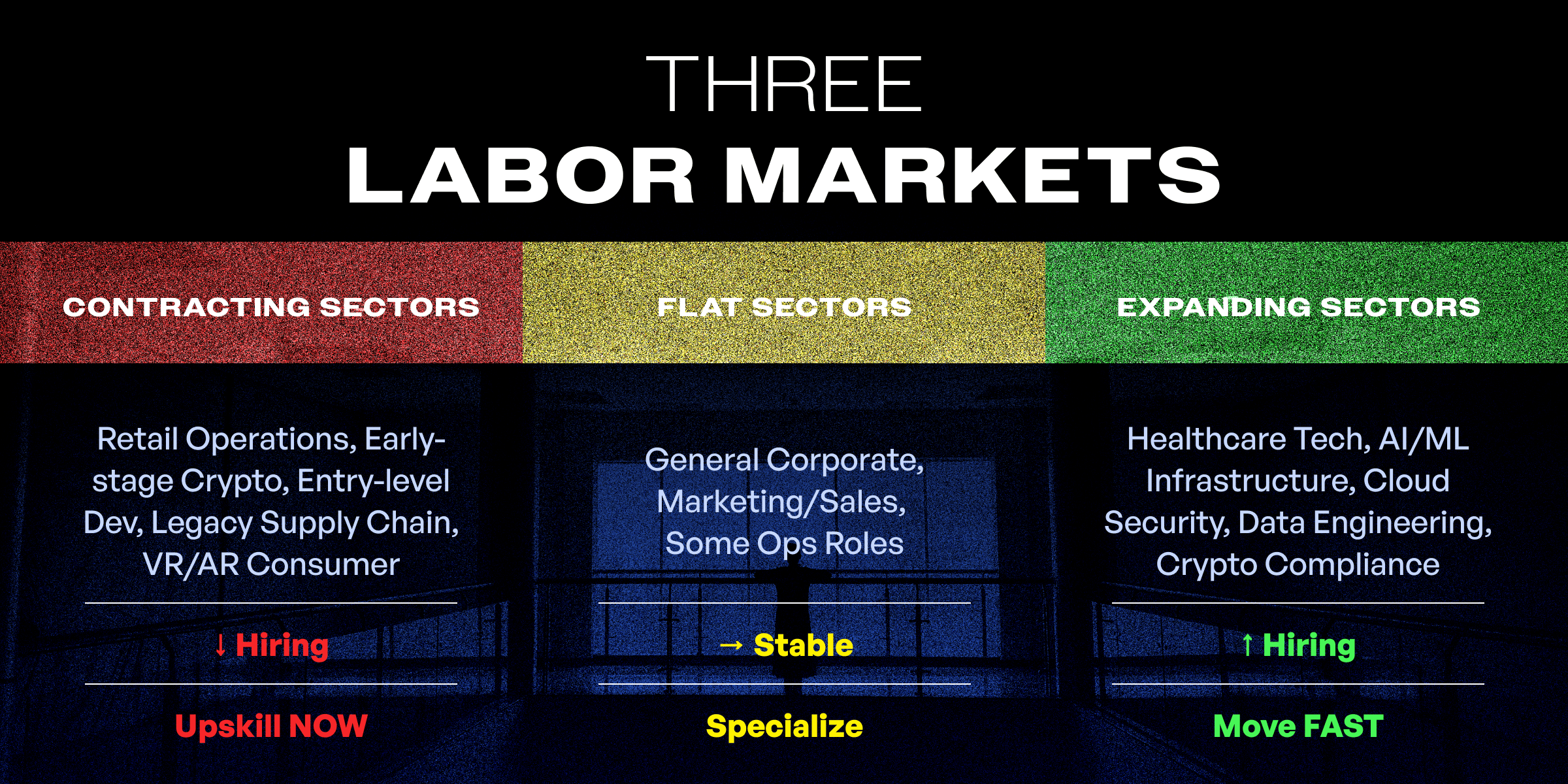 Your move: Upskill into growth sectors while employed (4-8 week timeline). Don't wait for layoffs—12+ month job searches are possible.